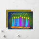 “Peace, love & light.” A playful, modern, artsy illustration of boho pattern candles in a menorah helps you usher in the holiday of Hanukkah. Assorted blue candles with colorful faux foil patterns overlay a rich deep green textured background. Faux copper diamond pattern foil on a green background for the reverse side. Feel the warmth and joy of the holiday season whenever you send this stunning, colorful, personalized Hanukkah flat greeting card. Matching envelopes, stickers, tote bags, wrapping paper, serving trays, home décor, and more are also available. Send this to someone special!