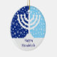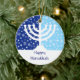 The perfect ornament for the interfaith family. A Hanukkah menorah is silhouetted against a field of dark and light blue stars and snowflakes. Your personalized message goes below. Also can be used as fan, light or blind pulls or wall decor. Available with matching products.