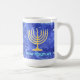 A glowing gold Hanukkah menorah and Hebrew text reading "Chag Chanukkah Sameach" (Happy Hanukkah) in glowing blue and white text superimposed on a blue and white fractal image reminiscent of snowflakes in a storm. Add your own additional text.