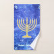 A glowing gold Hanukkah menorah and "Happy Hanukkah" in glowing blue and white text superimposed on a blue and white fractal image reminiscent of snowflakes in a storm. Chag Sameach!