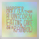 A slogan in colorful writing on a background of different colors, the slogan says: Happier Than A Unicorn Eating Cake On A Rainbow.
