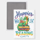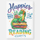 Vibrant, colorful design featuring an open book, colorful dragon, and flowers. The colorful text reads: "Happier when I'm reading". This design is available on a wide variety of products.