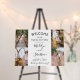 Welcome wedding guests to your ceremony or reception with an elegant custom 4 photo collage 18"x24" foam board sign. Pictures and all text are simple to personalize. (IMAGE PLACEMENT TIP: An easy way to center a photo exactly how you want is to crop it before uploading to the Zazzle website.) The modern minimalist black and white design features four images of your choice, chic handwritten style script calligraphy, art deco inspired vintage typography, and a customizable message that reads "welcome to our happily ever after." This wedding welcome sign is a stylish way to share engagement pictures while adding a personalized touch to your special day celebration decorations. Congratulations to the bride and groom!