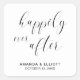 Typography wedding favor stickers featuring the message, "Happily Ever After" in black calligraphy with a heart dotting the "i", over a white background. Below are your names and date. The simple and minimal layout and lots of open space give this design a modern feel and the calligraphy lettering and heart give it a romantic twist. These elegant stickers add a personal touch to your favors.