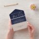 Chic and elegant elopement or private wedding announcement and wedding reception all in one invitation featuring light cream text on a navy blue background and "Happily Ever After Party" written in a mix of simple typography and a modern contemporary script. A tear away RSVP postcard provides a convenient envelope-free response from your guests.