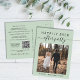 Modern sage green elopement or private wedding announcement and reception invitation postcard. The front features your photo and "Happily Ever After Party" in a mix of simple typography and a stylish script with swashes. Under your photo you can add your first names and wedding date. On the reverse you can personalize your message and invitation in more detail, create a QR code linked to your wedding website for your guests to scan for more information and to RSVP online, and add your names in a signature-like script.