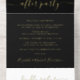 Elegant black elopement or private wedding announcement and casual reception all-in-one invitation that features "Happily Ever After Party" showcased in simple lettering and a chic modern script with swashes, your marriage announcement and reception invitation, and a white tear-away RSVP response postcard, all rendered in your choice of genuine gold, silver or rose gold foil.