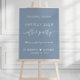 Chic dusty blue wedding reception welcome foam board sign and photo prop featuring "Welcome To Our Happily Ever After Party" in a mix of simple modern white typography and an elegant white script with swashes, your first names joined by a heart and your reception date. Perfect for receptions after an elopement or small private wedding.
