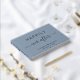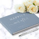 Elegant dusty blue wedding guest book featuring real silver foil, "Happily Ever After" in simple typography and a chic script with swashes, your names joined together by a heart and your wedding date. Customize your title on the spine and add a photo on the back.