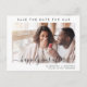 Modern save the date announcement postcard featuring your engagement photo and "Save The Date For Our Happily Ever After" in a mix of minimal typography and a stylish script with swashes. Personalize with your first names, wedding date and location in elegant typography. On the reverse, customize your save the date details and add your names in a signature-like script.