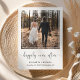 Simple and chic elopement or smaller wedding announcement and post-wedding reception or party invitation. The front features your photograph in a cut out square frame, "happily ever after" written in a trendy script with swashes and your first names and wedding date and location in modern typography. On the reverse side, personalize your wedding announcement and reception invitation and add your married names in a signature-like script.