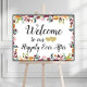 Wedding welcome poster sign welcomes guests to the bride and groom's "Happily Ever After". Features stylish script text framed by a beautiful rustic floral border of summer and fall watercolor flowers, including roses, dahlias, peony flowers, and greenery, in a gorgeous autumn palette of burgundy red, golden yellow, peach orange, blush pink, and shades of green. Includes two gold heart accents.