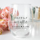 Chic wedding stemless wine glass for the bride and groom to celebrate with at their engagement party, rehearsal dinner, wedding reception, wedding anniversary, etc. featuring "Happily Ever After" in simple modern typography and an elegant script with swashes, your first names joined together by a heart and your wedding date.