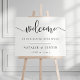 Welcome guests to your wedding with this elegant sign featuring black typography on crisp white with "welcome" at the top in elegant handwritten calligraphy script, and "...to our happily ever after" and your names and wedding date beneath.