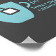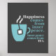 Fun wall art for tea lovers features aqua tea mug silhouette with funny quote that reads "Happiness comes from inner peace. Inner peace comes from TEA". Aqua and white design on charcoal gray background