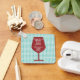 Fun keychain design for wine lovers features red wine glass with funny quote that reads "Happiness comes from inner peace. Inner peace comes from wine" on blue and white gingham background.