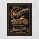 "Money can't buy happiness, but you can find it on a motorcycle, which you can buy." Fancy script and drawing of a custom bike, black & orange, on t-shirts and gifts.