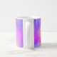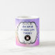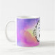Coffee mug with an inspirational quote which says "do what makes you happy". Illustrated with a cute kawaii bunny face holding a heart. The background is an abstract watercolor painting with luminous space clouds in soft pastel colors.