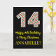 The front of this simple and fun Christmas themed and birthday themed December 25th birthday greeting card design features a large number "14", with a green/white/red stripes pattern. It also features the message "Happy 14th Birthday & Merry Christmas,", and an editable name. The background of the front is colored black. The inside features a custom birthday greeting message, or could perhaps be cleared and left blank if a message is to be written by hand instead. A customizable birthday card like this might be a fun way to send a message in celebration of somebody’s fourteenth birthday that also falls on December 25th (Christmas Day). [~Z0000405]