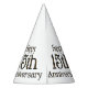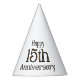 These party hats feature the words "Happy 15th Anniversary" in a unique print font with gold letters black outline. All paper hats have an attached elastic string printed in full vibrant colors made in the USA has a Minimum of 12 order requirement.