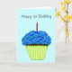 Happy First Birthday is written in black script. Light blue background. Personalize for any age. Yummy large chocolate cupcake in a yellow green pleated wrapper. Blue frosting with sprinkles and colorful flicker flame candle on top. Colorful birthday balloon images inside. Leave card verse, or personalize it with your own. Original Artwork and Design © TamiraZDesigns.