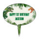 Make your little one's cake roar with excitement with this custom Happy 1st Birthday Dino Jungle Cake Topper! This oval-shaped topper features a vibrant, lush border of green jungle leaves and tropical foliage, framing a fun design that can include dinosaurs (as seen on the coordinating partyware). The text is fully customizable, allowing you to easily add your child's name (e.g., "JACKSON") and change the age if needed, making it the perfect focal point for a dinosaur-themed first birthday party.