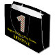 This fun and simple Christmas themed and birthday themed December 25th birthday gift bag design features a large number "1" with a green/white/red stripes pattern, along with the message "Happy 1st Birthday & Merry Christmas,", and a personalized name. The background is colored black. A gift bag like this might be fun to use when wrapping gifts or presents that are being given to somebody who was born on December 25th (Christmas Day) and who is celebrating their first birthday. [~Z0000407]