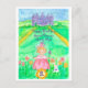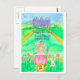 A sweet custom name happy birthday postcard featuring a baby princess in a soft pink dress standing in a happy wildflower patch with her bunny friend down the hill from the castle illustrated with watercolor. Fun card to customize for a special little girl!
