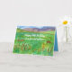 A age specific happy birthday card decorated with three cows in a green pasture with a rickety fence that is falling down, rolling green hills, and purple mountains in the distance illustrated with watercolor.