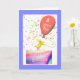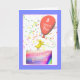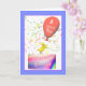 A cute and festive birthday card with my design of a little chicken standing on a birthday cake holding a balloon that says "3 years old!" with my verse inside.