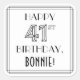 This luxurious Roaring Twenties era inspired art deco style birthday themed square sticker design has the message “HAPPY 41ST BIRTHDAY,”, along with a custom recipient name. The number “41ST” has a fancy geometric lined styling, and there is also a multi-line border around the birthday greeting message. Birthday themed stickers like these might be distributed or used at a party celebrating somebody’s forty-first birthday, or perhaps used when preparing invitations or gifts/presents for such an event. [~Z0000647]