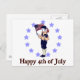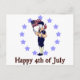 Happy 4th of July Vintage Art in antique colonial letters and a boy holding red holiday fireworks and a US flag, surrounded by 13 blue stars.