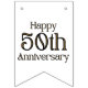This bunting banner feature the words "Happy 50th Anniversary" in a unique print font with gold letters black outline. All banners have single sided printing outdoor safe made with sturdy plastic polystyrene and thick plastic rope has (16) 5.5" x 8" swallowtail flags on a 6' long string.