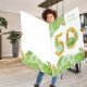 Jumbo birthday card for a 50th Birthday. The design features a large number 50 in textured gold, entwined with tropical leaves. On the outside, there is also a border of palm leaves, banana leaves, monstera leaves and colorful tropical flowers with the wording "happy birthday". The inside of the card is also decorated with the number 50 and the template is set up for you to add a custom message, if you wish. Please browse our store for more 50th birthday cards and gifts.