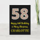 The front of this fun and simple Christmas themed and birthday themed December 25th birthday greeting card design features a large number "58" with a green, white, and red stripes pattern, along with the message "Happy 58th Birthday & Merry Christmas,", and a customizable name. The background of the front is colored black. The inside features a custom birthday greeting message, or could perhaps be cleared and left blank if a message is to be written by hand instead. A personalized birthday card like this might be a fun way to acknowledge somebody’s fifty eighth birthday that also falls on December 25th (Christmas Day). [~Z0000405]