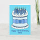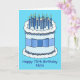 A simple illustration of a white and blue birthday cake, which is decorated with lit candles and a blue bow tied around it The image is accompanied by the words 'Happy 70th Birthday Nate'. The image s set against a turquoise colored background.