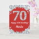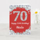 Happy 70th Birthday Red and Silver Glitter Card with personalized name. For further customization, please click the "Customize it" button and use our design tool to modify this template.
