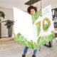 Jumbo birthday card for a 70th Birthday. The design features a large number 70 in textured gold, entwined with tropical leaves. On the outside, there is also a border of palm leaves, banana leaves, monstera leaves and colorful tropical flowers with the wording "happy birthday". The inside of the card is also decorated with the number 70 and the template is set up for you to add a custom message, if you wish. Please browse our store for more 70th birthday cards and gifts.
