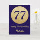 Happy 77th Birthday Navy Blue and Gold Glitter Card with personalized name. For further customization, please click the "Customize it" button and use our design tool to modify this template.