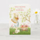Cute watercolor happy 7th birthday for young granddaughter, featuring a country girl hugging a rooster while a kitten looks over a wagon full of strawberries and watches a puppy playing with a ball of string in the green grass.