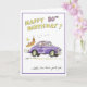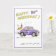 Funny greeting card for 80th birthday. Lady in old car with union jack headscarf racing off to enjoy her birthday.