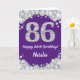 Happy 86th Birthday Purple and Silver Glitter Card with personalized name. For further customization, please click the "Customize it" button and use our design tool to modify this template.