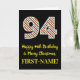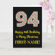 The front of this simple and fun Christmas themed and birthday themed December 25th birthday greeting card design features a large number "94" with a red, white, and green stripes pattern, along with the message "Happy 94th Birthday & Merry Christmas,", and an editable name. The background of the front is colored black. The inside features a customizable birthday greeting message, or could perhaps be cleared and left blank if a message is to be written by hand instead. A customizable birthday card like this might be a fun way to send a message in celebration of somebody’s ninety fourth birthday that also falls on Christmas Day (December 25th). [~Z0000405]