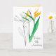 A card to wish a special couple a happy 9th wedding anniversary featuring the traditional flower for this specific year, Bird of Paradise, sketched with pencil and painted with watercolor in lovely vivid tropical colors. In the Language of Flowers Bird of Paradise symbolizes magnificence, joy, and paradise. The flower was chosen for this anniversary to honor the unexpected aspects of romance.