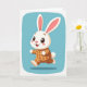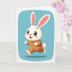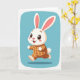 This card shows a white-furred, rabbit-like character 🐰 centered on the front, drawn in a smooth, animated style with big dark eyes, rosy cheeks, and an open smile. The bunny is caught mid-step as if hurrying toward a friend, with its gaze angled forward in a way that feels eager and affectionate. It wears a warm brown outfit with a neat grid texture, and a small fluffy tail peeks out at the back. The background is a flat cerulean blue field that keeps the character in full focus, with soft, even lighting and no harsh shadows. A short Easter greeting sits near the top in light pink lettering, with a smaller line of text placed near the bottom in white for contrast. A tiny cluster of simple spring accents 🌷 rests beside the lower text, adding a gentle touch without crowding the scene. The bunny’s rounded ears tilt slightly back as it moves, and the brown grid pattern is visible across the outfit from chest to knees.