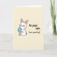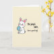This design shows a cute, upright bunny-like animal centered on a soft cream background, with long ears tipped in gentle pink and a fluffy tail peeking behind 🐰. Its cheeks have rosy blush spots and its small smile feels like it’s meant for a close friend, the kind that makes you lean in a little. The character holds an egg-shaped decoration in light blue with darker blue polka dots, cradled carefully in its paws like a little gift. Dark outlines define the figure while the pastel coloring keeps the scene calm and tender. A casual hand-lettered message sits nearby in dark ink, arranged to the side of the character so the art stays front and center. The words are spaced loosely and read like a friendly note, adding a gentle, affectionate tone without crowding the illustration 🌷. The egg’s dotted pattern and the soft pink ear tips stand out against the creamy backdrop.