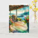 Happy Anniversary card. Pretty ai rendition of a watercolor style deck with potted flowers at a lake house over looking the water.