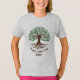 Tree with green leaves, brown trunk, brown roots and, matching in color the slogan: Happy Arbor Day
