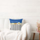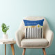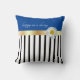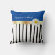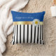 Add a pop of pizzaz to your summer decor. This design works well with most decors. The bottom three-thirds of the pillow is black and whites stripes with the remaining portion in a solid blue. Pulling this look together there is a gold colored ribbon with a single daisy. The text "happy as a daisy" can be personalized.