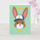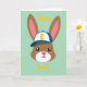 This card features a stylized long-eared woodland creature’s head centered on a mint-green background, with a sweet, friendly look that feels like a gentle nod to friendship 🐰. Its large glossy black eyes include tiny white highlights and light lashes, giving it a soft, attentive gaze. A small pink nose, rosy cheeks, and a simple curved smile add a tender, affectionate expression. The tall ears are warm brown on the outside with soft pink inner sections, framing the face like a cozy embrace. A white baseball cap sits slightly forward, with a deep blue brim and a sunny yellow initial on the front, adding a youthful touch. The word “Happy” appears above the character in yellow lettering, and “Baby” appears below in matching yellow, both centered to balance the layout 🌷. The background stays uncluttered so the character and text stand out clearly, with the yellow words hovering above and below the cap and ears on the mint field.